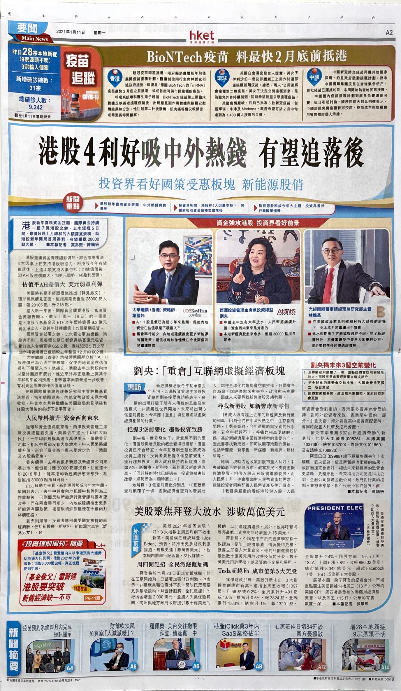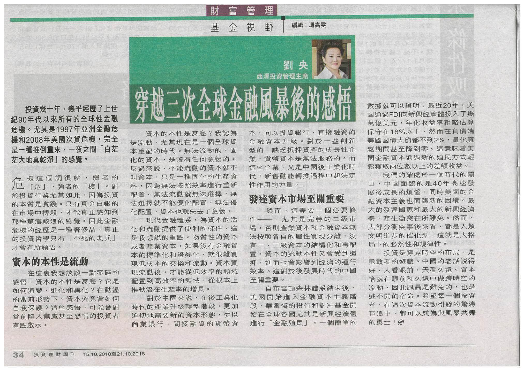 西澤投資劉央:香港的股市會給大家一個驚喜Sina.com / 2021-12-15 女股神劉央走出巴菲特框架 西澤投資趨勢投資達到55%回報率Zhitongcaijing.com / 2021-11-05 【新港股】第二批出爐 | 深度解密78%超高回報的投資秘訣Gelonghui.com / 2021-09-21 穿越2021年股市驚濤駭浪,接棒78%回報的【新港股】第二批名單出爐Zhitongcaijing.com / 2021-09-21 西澤投資第二批【新港股】出爐—震蕩中趨勢投資發掘港股潛力公司Zhitongcaijing.com / 2021-09-21 恒生科技指数创史上第二大单日涨幅,腾讯、京东、快手等走过困难期?财联社 / 2021-08-24 港交所推首只MSCI中国A50互联互通指数期货合约:更为南北互联互通引活水财联社 / 2021-08-20 港股瀉1129點跌穿27000關口 專家:政策重拳出擊長期利好China News / 2021-07-26 China's new requirements for overseas listings put Hong Kong in a much better position: InvestorCNBC.com / 2021-07-23 Global Business:Opportunities & economic integration in the Guangdong-Hong Kong-Macao Greater Bay AreaCGTN.com / 2021-07-01 澤被萬物/探究價值投資衰落(下)\西澤研究院院長 趙建Takungpao.com / 2021-06-15 澤被萬物/探究價值投資衰弱(上)\西澤研究院院長 趙建Takungpao.com / 2021-06-14 西澤投資積極實踐綠色金融學習 籌建可持續性發展投資產品文匯網 / 2021-05-07 Time for big tech to earn easy money is over: Fund managerCNBC.com / 2021-04-30 Atlantis launches first quant fundHFM / 2021-03-16 Two Sessions Econ Forum: How has HK's competitiveness financial hub changed?CGTN.com / 2021-03-12 專訪|女股神劉央親授止賺兩大原則 重申價值投資壽終正寢香港01 / 2021-02-16 牛年来了,港股的牛市还会远吗?中国新闻网 / 2021-02-11 【騰訊700】騰訊回調唔洗怕? 劉央社交平台發文力撐 「2021年騰訊1000元指日可待」iMoneymag.com / 2021-01-26 一騎絕塵,西澤投資新港股指數首月回報超60%Finet.com / 2021-01-25 More money is expected to flow into Hong Kong in 2021: Fund managerCNBC.com / 2021-01-19 【2021展望】劉央:互聯網顛覆了一切 恒指30000點指日可待 hket.com / 2021-01-11 港股4利好吸中外熱錢 有望追落後 - 投資界看好國策受惠板塊 新能源股俏HKET / 2021-01-11